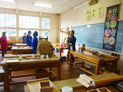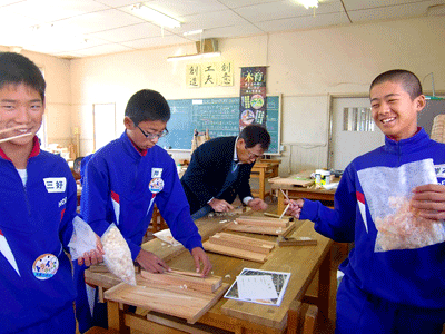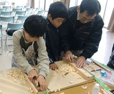 [指導要綱] | ・木育講演--------二宮金次郎 ・コースター作り----張り合わせ、面取り ・my 箸づくり------カンナかけ、面取り ・消しゴムはんこ----図案転写、彫り作業 |