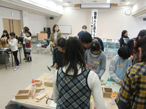 1月の開催予定がインフルエンザの影響で延期となっておりましたが無事開催にこぎ着けました。雪のちらつくこの冬一番の寒さの中たくさんの保護者の方にご参加いただきました。ありがとうございました。 たくさんの方に木使い運動を知っていただき木にふれていただきたいです |