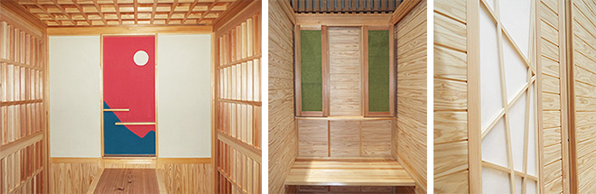 誰でも組み立てできる和風ゲストルーム(左) 堀コタツ式で楽に着席でき、座板使用で就寝可能のユアROOM(中央・右)