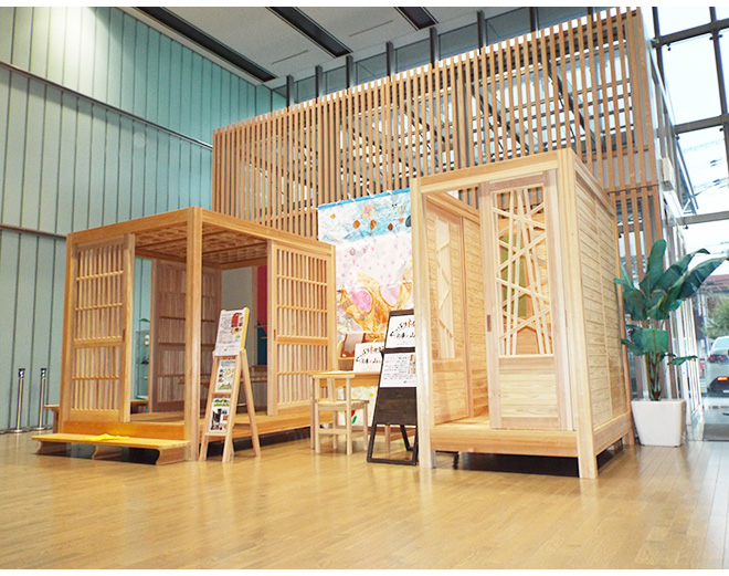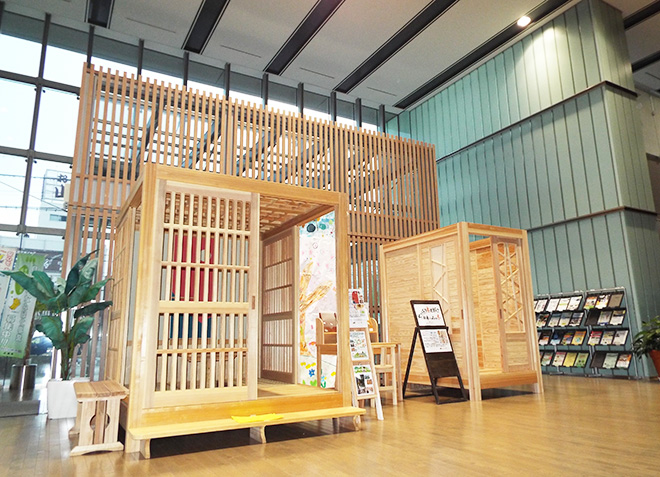 東播磨生活創造センターかこむのエントランスロビーに展示された、兵庫県産の木材を使った和風ゲストROOM(左)ユアROOM(右)