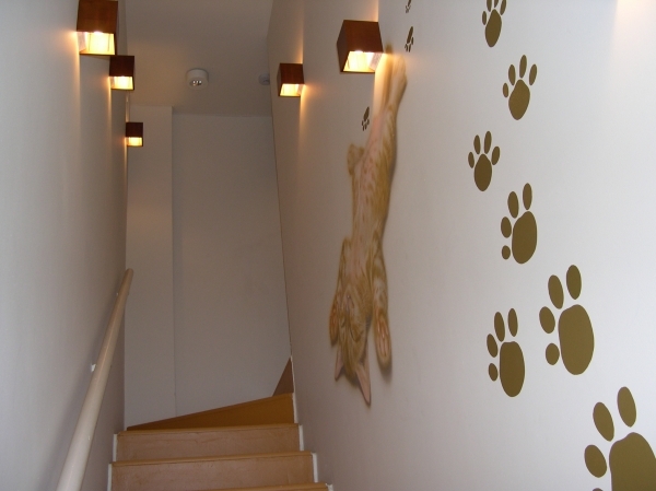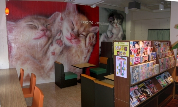 長年使われていなかったビルの2F・3F部をリフォームし、インターネットカフェとしました。壁には猫の絵が多数描かれ、かわいらしい空間になっています。